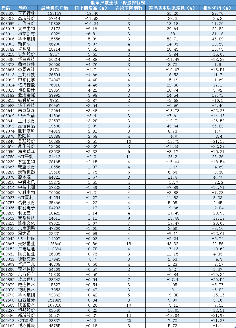 股东户数连续下降个股中,连降时间较长的有*ST康盛、美好置业等,其中,*ST康盛最新股东户数为28337户,已连续减少20期,累计降幅为30.03%,美好置业股东户数连降18期,最新户数为126600户,累计降幅19.97%,股东户数连降期数较多的还有新筑股份、*ST平能、英联股份等。从最新一期的股东户数下降幅度看,降幅较大的有天齐锂业、杰瑞股份、广信股份等,最新股东户数分别下降12.46%、11.92%、10.24%。