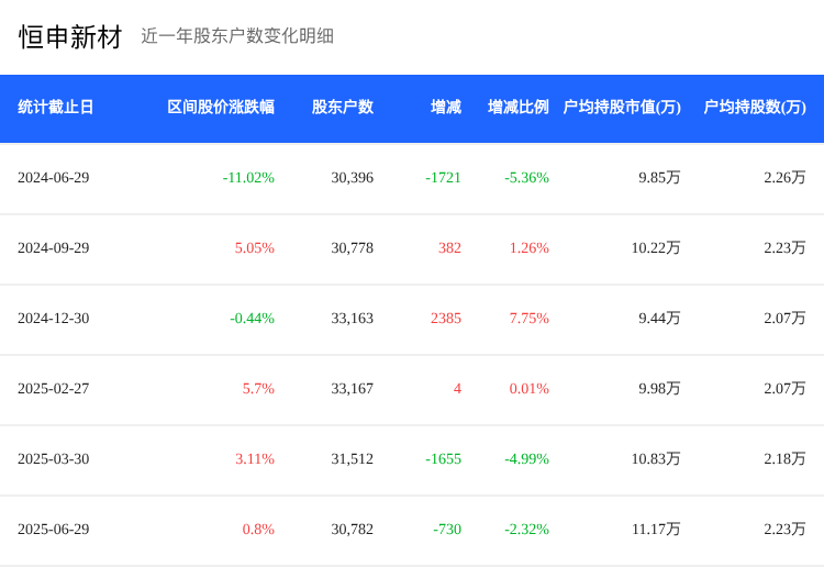 根据最新数据显示,截至2025年6月30日,恒申新材(股票代码:000782)的股东户数为3.08万户,较上期减少了2.32%。与此同时,户均持股数量增至2.37万股,环比增长3.2%,户均持股市值达到了11.17万元。