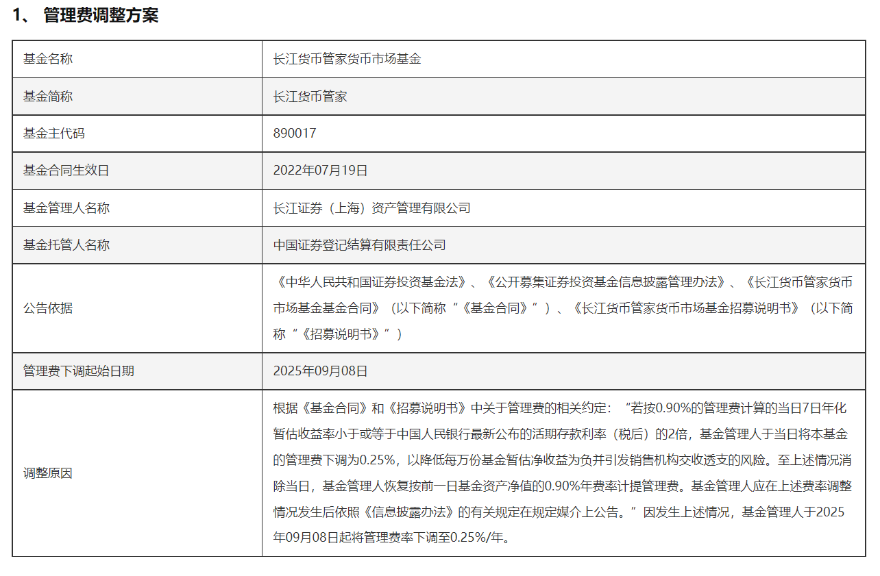 9月9日,长江证券(上海)资产管理有限公司发布公告称,根据《基金合同》和《招募说明书》中关于管理费的相关约定:“若按0.90%的管理费计算的当日7日年化暂估收益率小于或等于中国人民银行最新公布的活期存款利率(税后)的2倍,基金管理人于当日将本基金的管理费下调为0.25%,以降低每万份基金暂估净收益为负并引发销售机构交收透支的风险。至上述情况消除当日,基金管理人恢复按前一日基金资产净值的0.90%年费率计提管理费。基金管理人应在上述费率调整情况发生后依照《信息披露办法》的有关规定在规定媒介上公告。”因发生上述情况,基金管理人于9月8日起将长江货币管家货币市场基金的管理费率下调至0.25%/年。