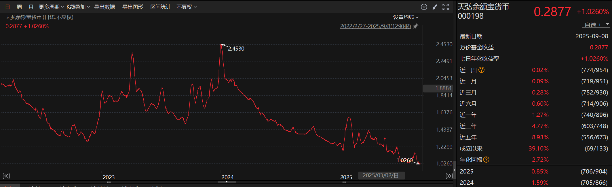 以天弘余额宝货币基金为例,2024年初,7日年化收益率一度超过2.45%,此后开始震荡下行,截至今年9月8日,已经跌至1.026%,再次创下历史新低。