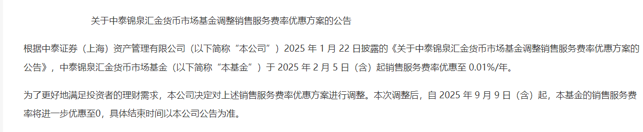 部分货币基金甚至将销售服务费率降为0。9月9日,中泰证券(上海)资产管理有限公司发布公告称,为了更好地满足投资者的理财需求,自9月9日(含)起,中泰锦泉汇金货币基金的销售服务费率将进一步优惠至0。