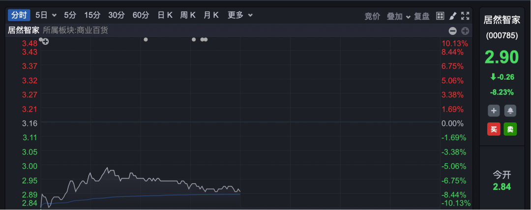 7月28日,居然智家(000785)大幅低开,甚至一度报出跌停价。截至午间收盘,居然智家跌8.23%,报2.9元/股,总市值180.6亿元。
