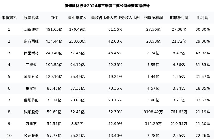 北新建材最新报告期数据为三季度,下表汇总了装修建材行业内市值靠前的公司三季度主要经营数据