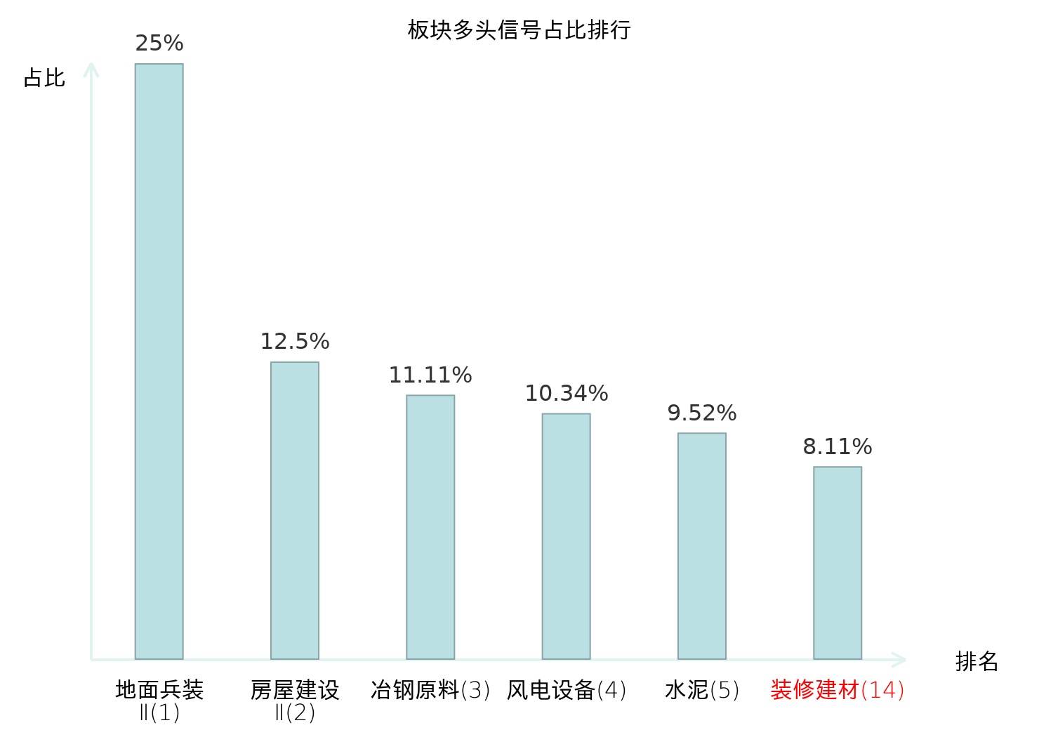 全市场所有行业板块中主力多头信号占比排名中,地面兵装Ⅱ板块位居第一。房屋建设Ⅱ板块名次提升最快,较昨日上升117位。