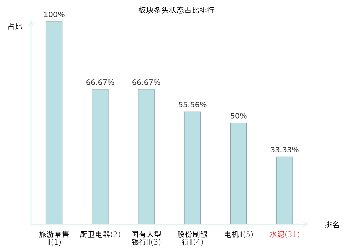 全市场所有行业板块中主力多头状态占比排名中,旅游零售Ⅱ板块位居第一。水泥板块名次提升最快,较昨日上升80位。