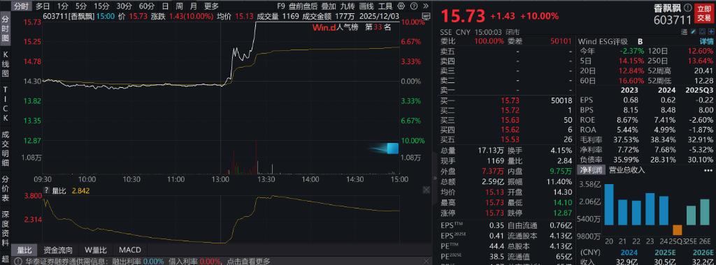 该股午后由跌转涨,封死涨停板。而其逻辑更是让人啼笑皆非:香飘飘也是航天概念,因为它销量早都绕地球几圈了。