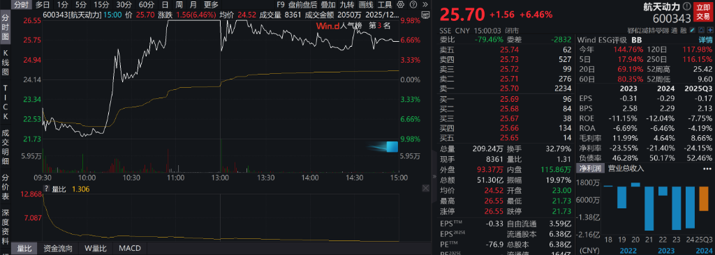 商业航天概念股表现分化,航天动力盘中上演“地天板”,收涨6.46%,超捷股份乾照光电上海港湾等股午后则出现跳水。