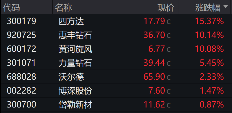 超硬材料概念股爆发,四方达惠丰钻石涨超10%,黄河旋风涨停。