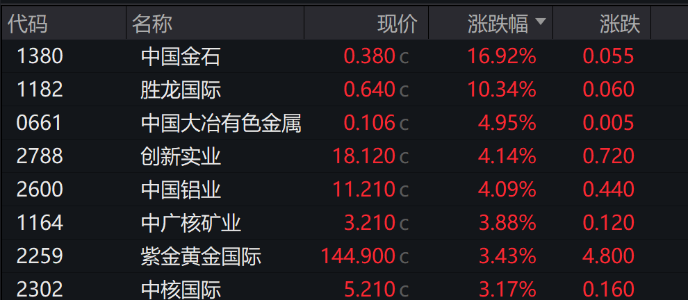 中国大冶有色金属中国铝业洛阳钼业涨幅靠前
