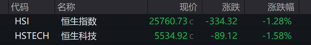 港股:截至发稿,恒指跌1.28、科指跌1.58%。