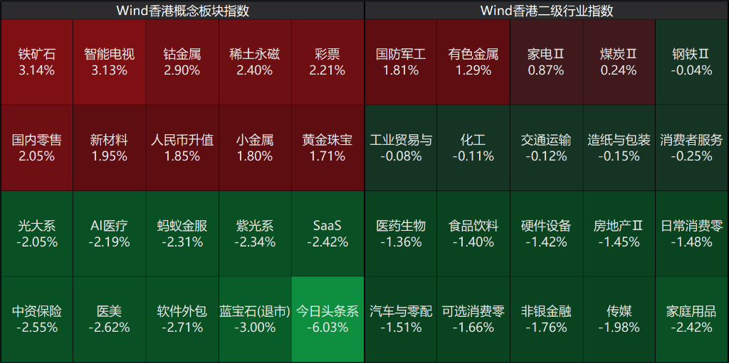 板块方面,铁矿石、智能电视概念领涨,钴金属、稀土永磁等资源板块走强,国内零售、黄金珠宝等消费题材活跃;下跌方面,科技与金融板块全线调整,今日头条系、蓝宝石(退市)、软件外包等科技概念深度回调,中资保险、医美等非银金融与消费服务同步走弱。