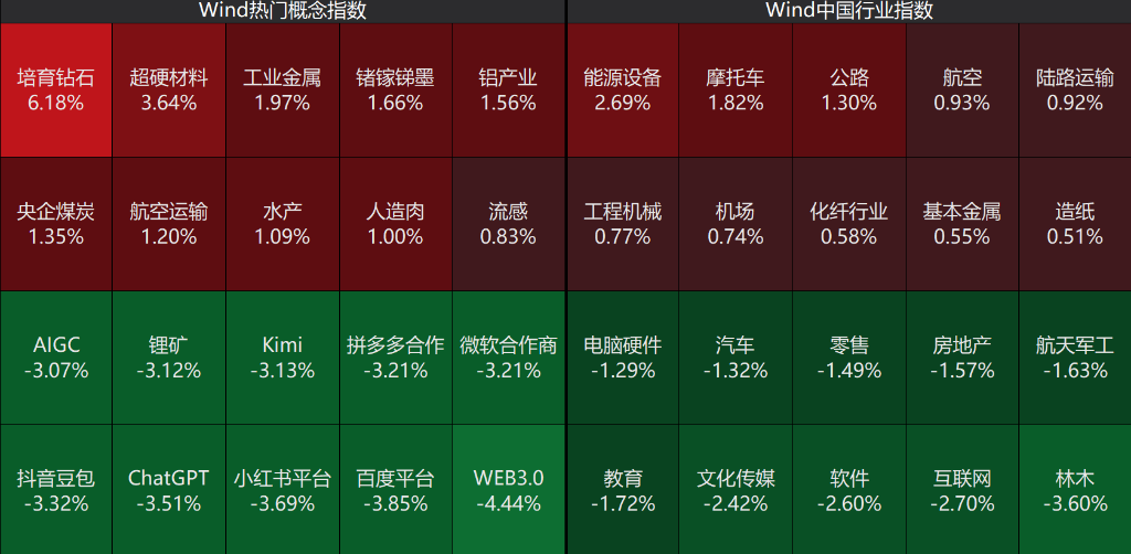 盘面上,个股跌多涨少,沪深京三市超3800股飘绿,今日成交超1.68万亿。板块方面,培育钻石、超硬材料等高端制造概念领涨,工业金属、锗镓铬墨等稀缺资源板块走强,航空运输、水产等出行消费题材活跃;下跌方面,AI应用与平台经济全线重挫,WEB3.0、小红书平台、拼多多合作等概念深度调整,锂矿、航天军工等前期热点同步走弱。