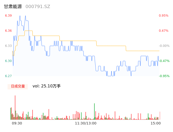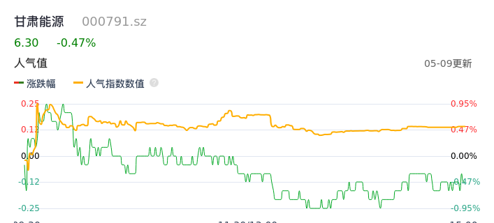 05月09日,甘肃能源收报6.30,股价涨幅-0.47%,成交金额1.59亿元,换手率1.57%。