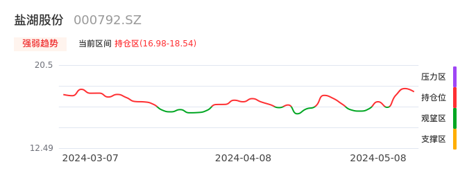 我们来看一下该股的九方特色指标强弱趋势的情况:盐湖股份近日从观望区上穿到持仓区。股价短期站上多头区域,但还未完全站稳。后续重点关注多空分界点的争夺:16.98元。如未能有效站稳则可能重新回到空头行情。