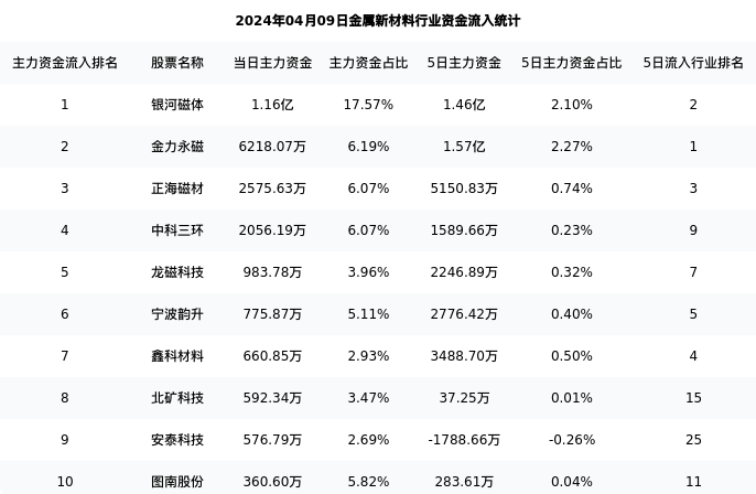 从主力资金流向来看,金属新材料行业今日主力资金流入13.22亿元,在所有申万二级行业中排名:15/131。