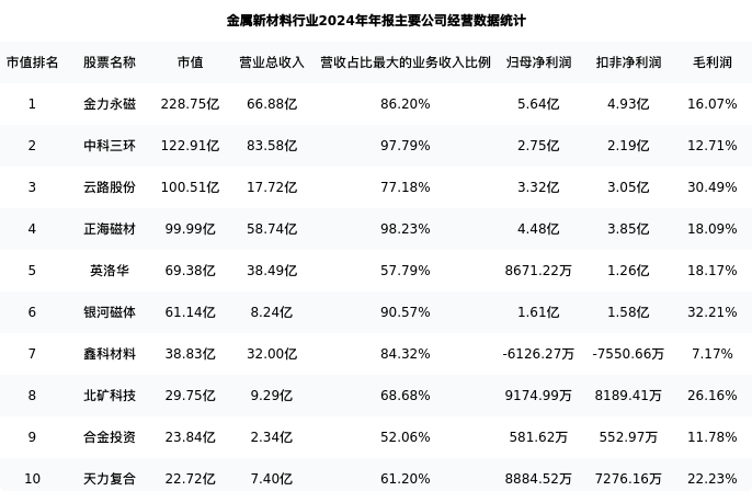 英洛华最新报告期数据为年报,下表汇总了金属新材料行业内市值靠前的公司年报主要经营数据