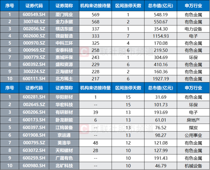 可关注标的方面,筛选稀土永磁概念股,截至今日收盘,厦门钨业、金力永磁、横店东磁、领益智造、中科三环、安泰科技、惠城环保、盛和资源、正海磁材、北方稀土等股近1年机构调研量居前。若以股价活跃度统计,不计算ST股,华阳新材、华宏科技、有研新材、卧龙新能、江钨装备、京运通、英洛华、天和磁材、广晟有色、北矿科技等股涨停次数较多。