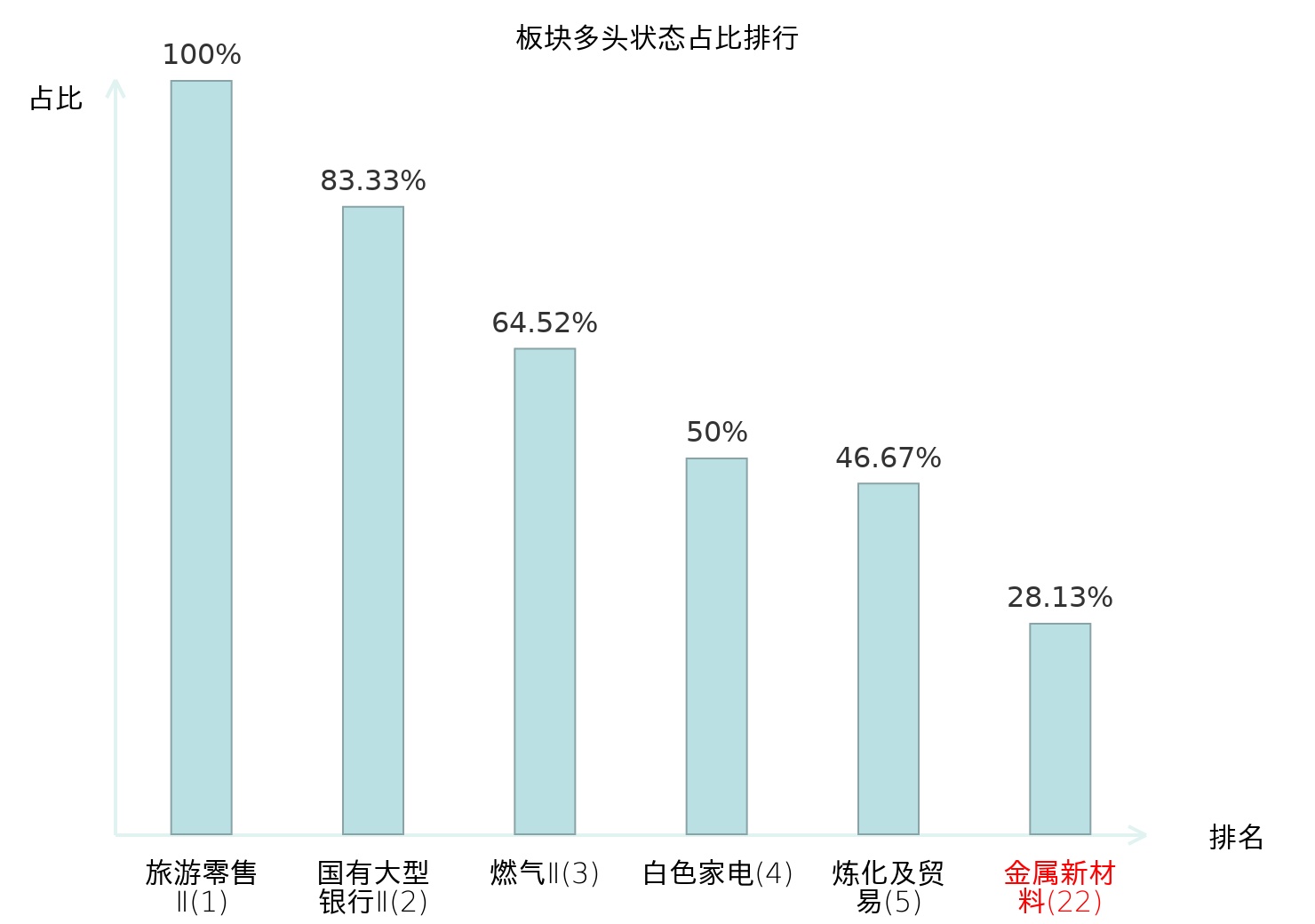 全市场所有行业板块中主力多头状态占比排名中,旅游零售Ⅱ板块位居第一。农产品加工板块名次提升最快,较昨日上升82位。