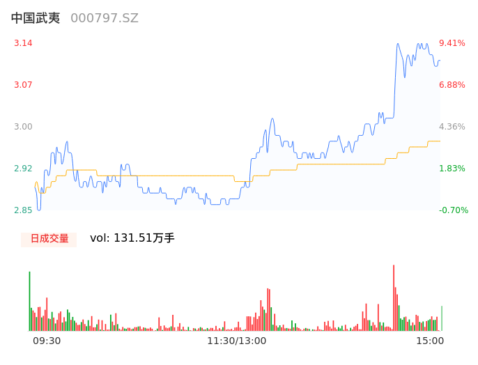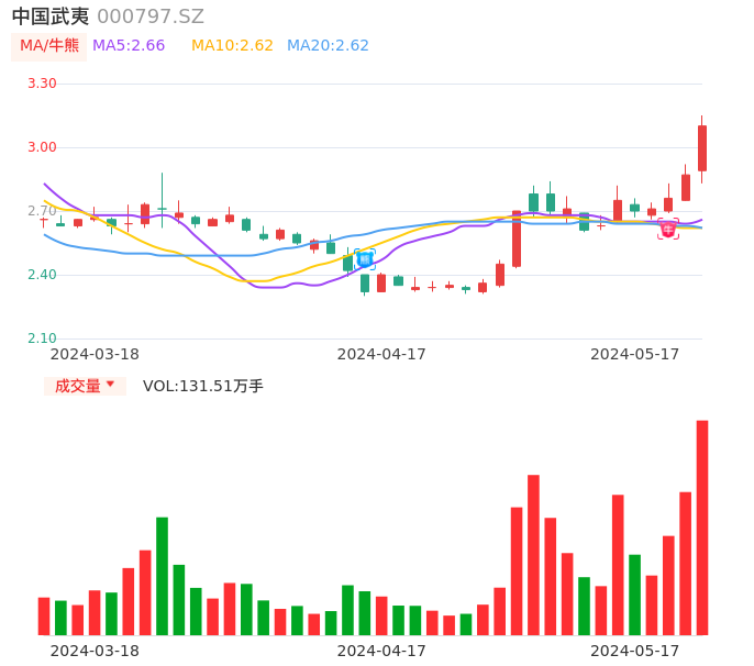 05月17日,中国武夷收报3.10,股价涨幅8.01%,成交金额3.91亿元,换手率8.38%。