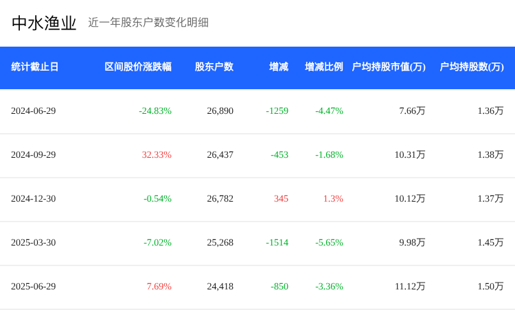 对比行业数据,截至2025年6月30日,渔业行业的平均股东数和平均户均持股市值未提供具体数值,但中水渔业的股东户数减少和户均持股市值的增加反映了其在行业内的表现较为优异。