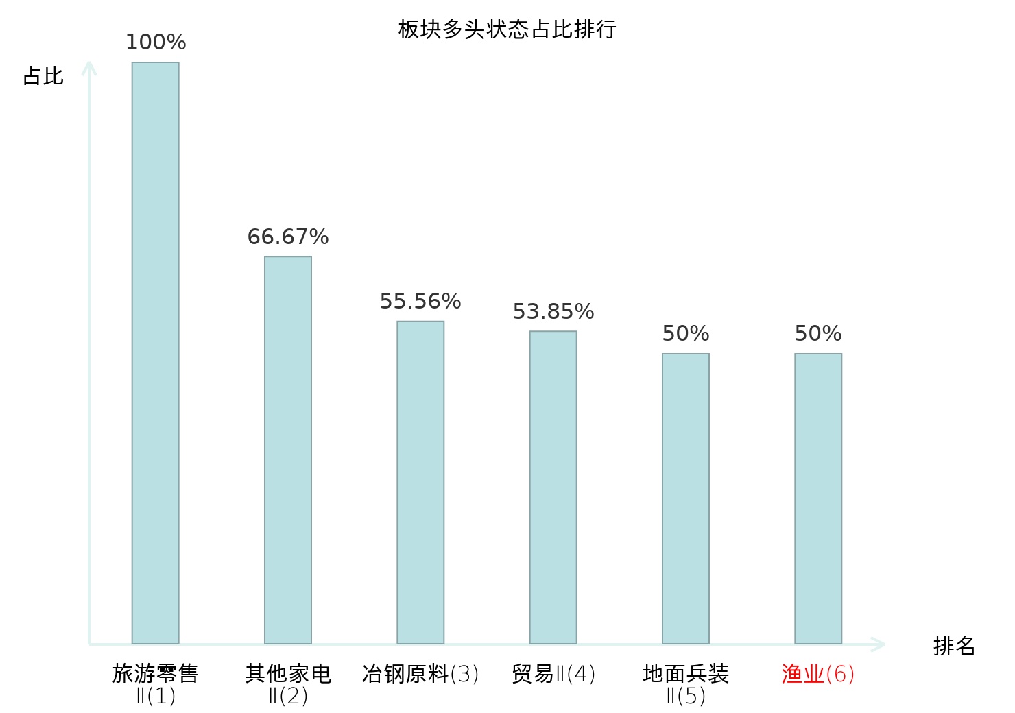 全市场所有行业板块中主力多头状态占比排名中,旅游零售Ⅱ板块位居第一。房屋建设Ⅱ板块名次提升最快,较昨日上升58位。