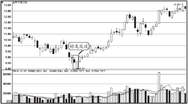 当空方力量用尽全力下跌后,后市空方力量已不能再增强,而是呈现出衰竭状态,这时多方力量乘机反击,最终在收盘时收在前一根阴线的收盘价之处或相近位置上,第二根阳线表明多头力量将当天开盘时的空方力量所攻下的阵地全部收复,但多头力量也只是与空头力量打平手或接近于平手。好友反攻实质上是主力机构通过大幅低开以探明底部,为下一步开展反弹行情奠定基础,其中的低开阳线就是反弹信号。