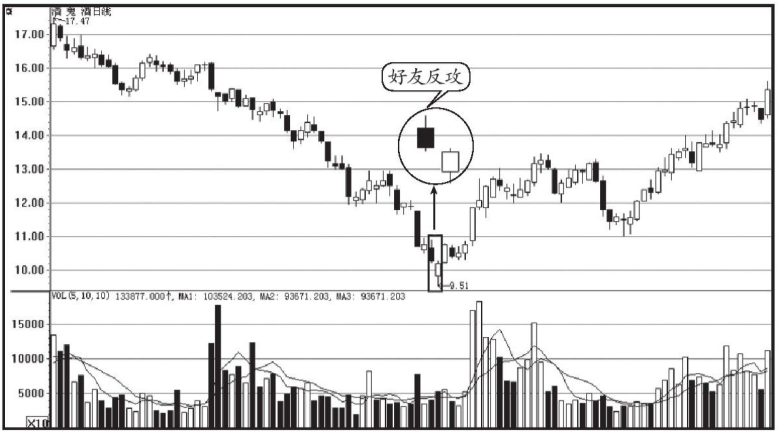 如图2-22所示的是酒鬼酒(000799)的日K线走势图。该股从前期高点17.47元开始进入下跌趋势,在图中所示的方框内出现好友反攻的K线组合,第一个交易日收出一根带上下影线的中阴线,第二天股价大幅低开,随后被多头拉起,一路高走,收出一根带上下影线的中阳线,收盘价和前一个交易日的收盘价基本相同。
