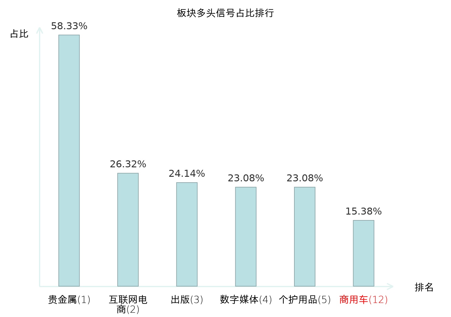 全市场所有行业板块中主力多头信号占比排名中,贵金属板块位居第一。贵金属板块名次提升最快,较昨日上升108位。