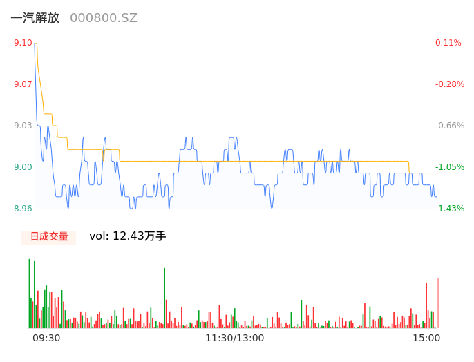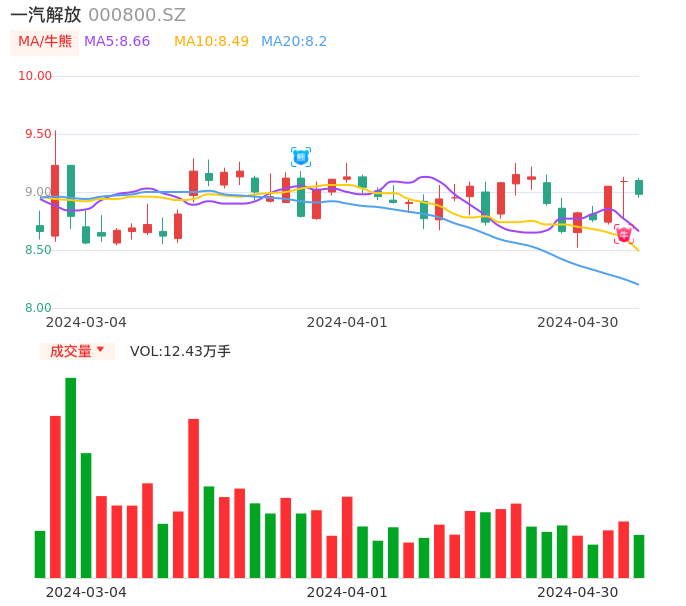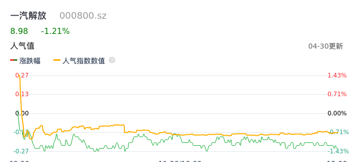 04月30日,一汽解放收报8.98,股价涨幅-1.21%,成交金额1.12亿元,换手率0.27%。