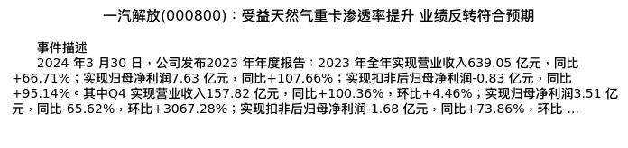 值得注意的是:2024年04月山西证券的刘斌/张子峰分析师,首次发布关于一汽解放的研究报告,标题为:一汽解放(000800):受益天然气重卡渗透率提升 业绩反转符合预期。
