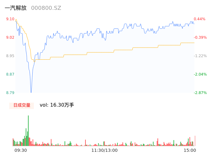 04月29日,一汽解放收报9.09,股价涨幅0.44%,成交金额1.47亿元,换手率0.35%。