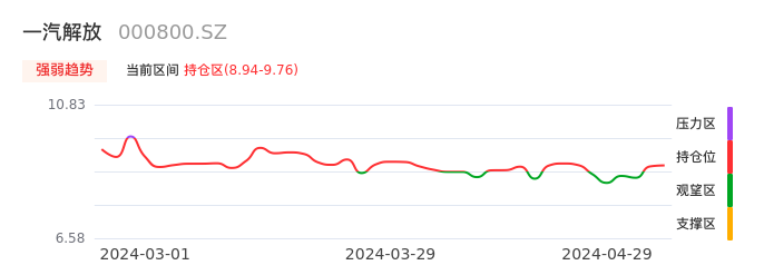 我们来看一下该股的九方特色指标强弱趋势的情况:一汽解放近日从观望区上穿到持仓区。股价短期站稳多头区域,上升动能仍较为充足,可积极关注。后续重点关注上方压力位:9.76元是否能突破上攻。