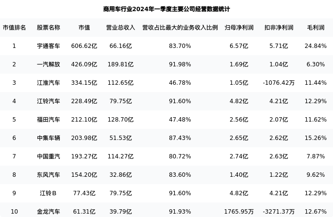 一汽解放最新报告期数据为一季度,下表汇总了商用车行业内市值靠前的公司一季度主要经营数据