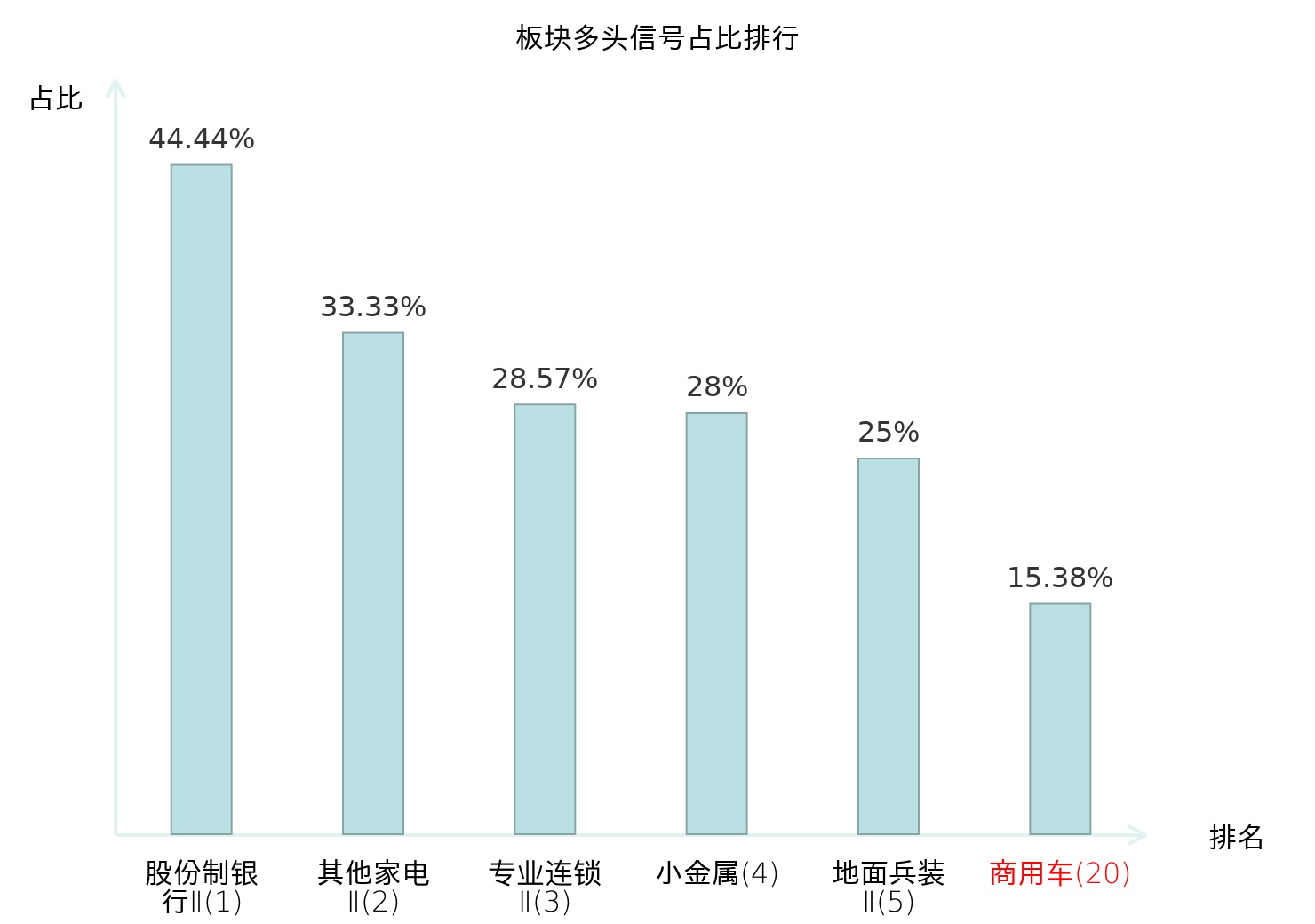 全市场所有行业板块中主力多头信号占比排名中,股份制银行Ⅱ板块位居第一。其他家电Ⅱ板块名次提升最快,较昨日上升127位。