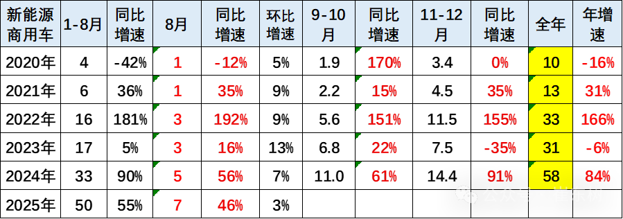 2024年新能源商用车销量57.9万台,同比增长84%;2025年8月份达到7.36万台,同比增长46%,环比增3%。在2024年末政策翘尾后,2025年1月新能源表现相对较弱,2-8月同比暴增,1-8月累计达到50万台,同比增长55%。