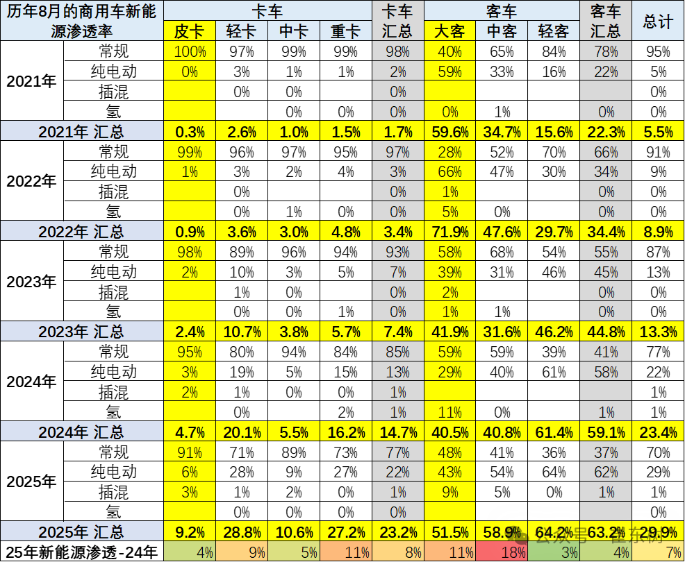 其中的卡车新能源渗透率23%,客车新能源渗透率63%,较同期均有大幅提升。其中重卡、轻卡和大中客的电动车渗透率提升较大。