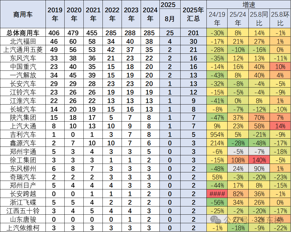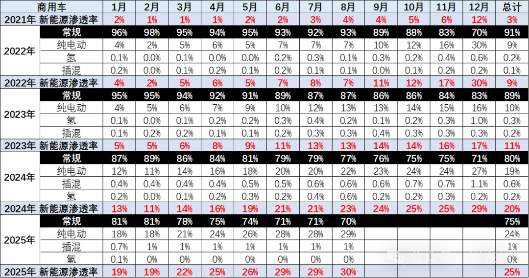 从2019-2021年,整个新能源商用车的渗透率在3%左右水平,2022年达到9%,2023年达到11%,2024年全年达到20%,2025年1-8月就达到渗透率25%的良好水平,体现了新能源商用车强势增长良好态势。