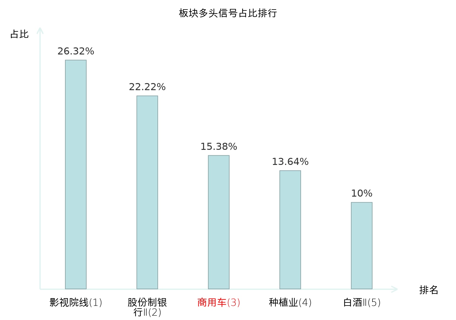 全市场所有行业板块中主力多头信号占比排名中,影视院线板块位居第一。股份制银行Ⅱ板块名次提升最快,较昨日上升115位。