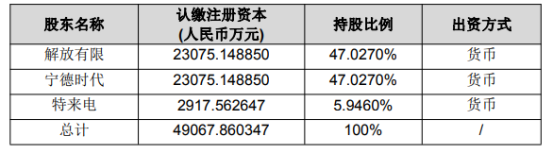 上证报中国证券网讯11月27日晚,一汽解放披露公告显示,公司拟通过全资子公司解放有限对其合营企业解放时代现金增资1.91亿元。解放时代现有股东宁德时代及本次新引入投资者特来电拟同步对解放时代进行增资,三方增资合计4.12亿元。本次交易完成后,解放有限、宁德时代、特来电对解放时代的持股比例分别为47.027%、47.027%及5.946%。