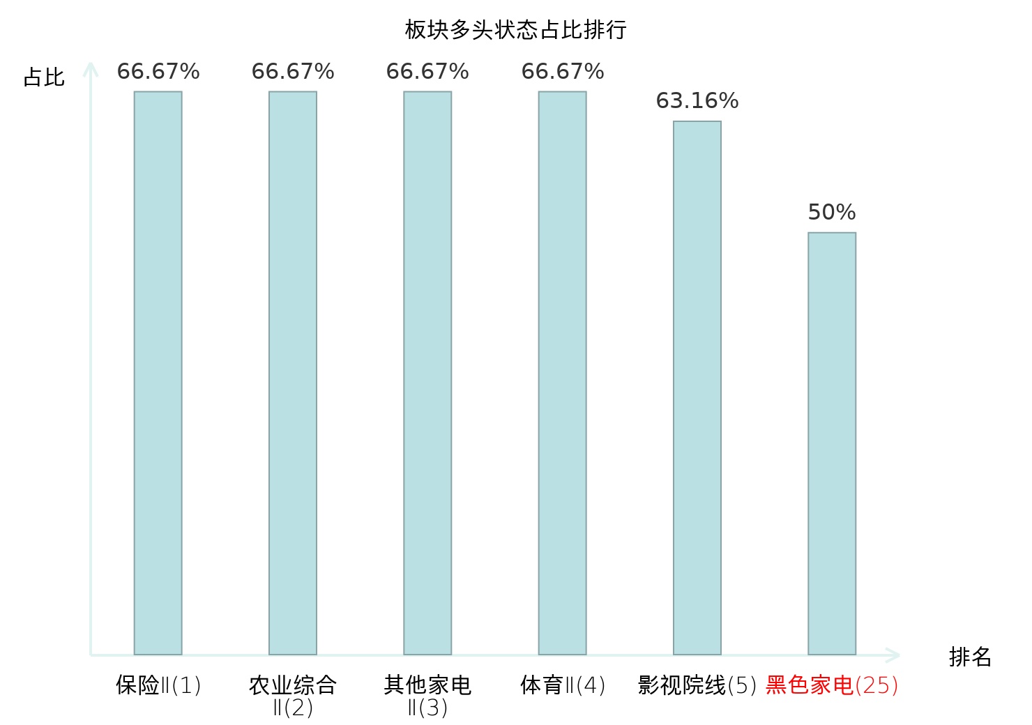 全市场所有行业板块中主力多头状态占比排名中,保险Ⅱ板块位居第一。冶钢原料板块名次提升最快,较昨日上升53位。