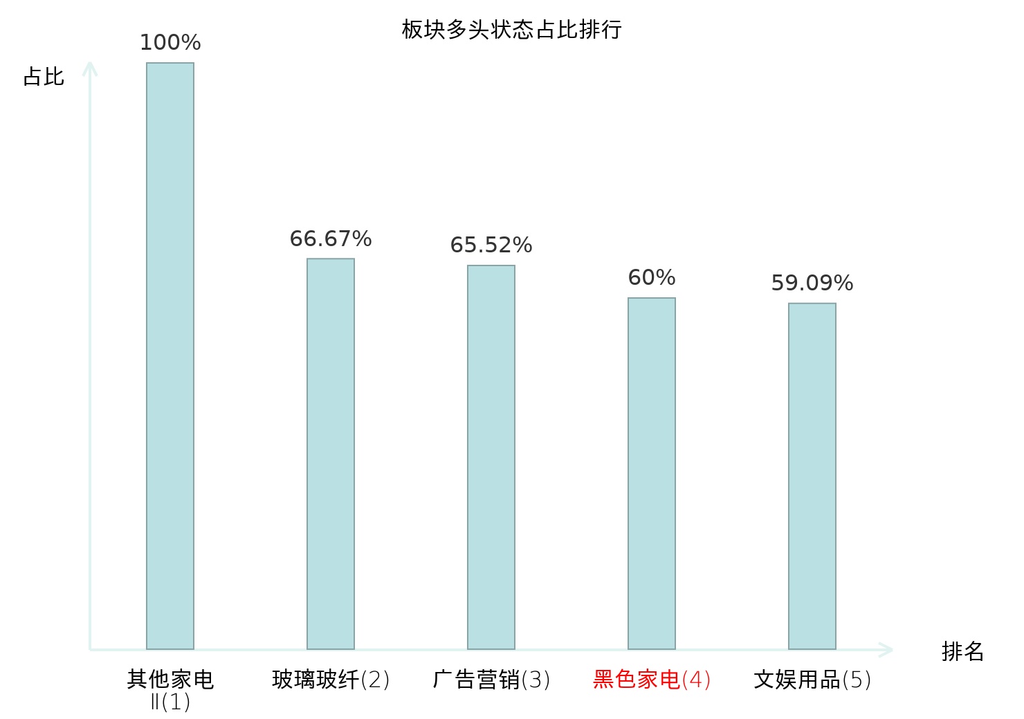 全市场所有行业板块中主力多头状态占比排名中,其他家电Ⅱ板块位居第一。体育Ⅱ板块名次提升最快,较昨日上升57位。