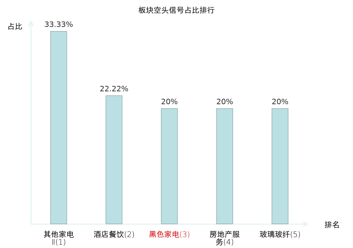 全市场所有行业板块中主力空头信号占比排名中,其他家电Ⅱ板块位居第一。家居用品板块名次提升最快,较昨日上升111位。