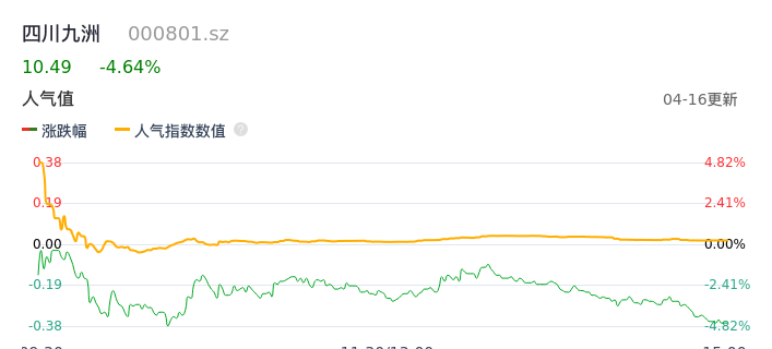 04月16日,四川九洲收报10.49,股价涨幅-4.64%,成交金额4.24亿元,换手率3.88%。