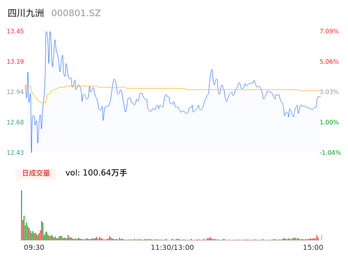 04月22日,四川九洲收报12.91,股价涨幅2.79%,成交金额13.03亿元,换手率9.84%。