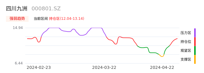 我们来看一下该股的九方特色指标强弱趋势的情况:四川九洲近日从观望区上穿到持仓区。股价短期站稳多头区域,上升动能仍较为充足,可积极关注。后续重点关注上方压力位:13.14元是否能突破上攻。