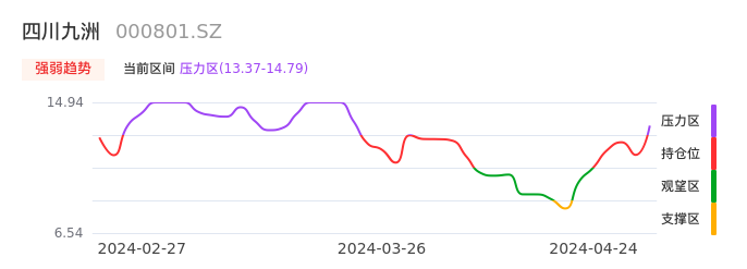 我们来看一下该股的九方特色指标强弱趋势的情况:四川九洲近日从持仓区进入压力区。股价出现一波快速拉升行情,目前上升动能较为充足可继续持股。注意今日上方压力位:14.79元是否能有效突破。