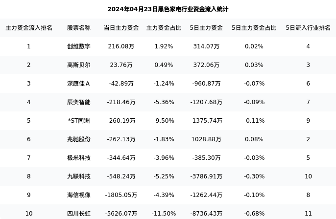从主力资金流向来看,黑色家电行业今日主力资金流入5.86亿元,在所有申万二级行业中排名:72/131。