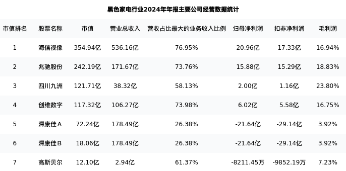 四川九洲最新报告期数据为年报,下表汇总了黑色家电行业内市值靠前的公司年报主要经营数据
