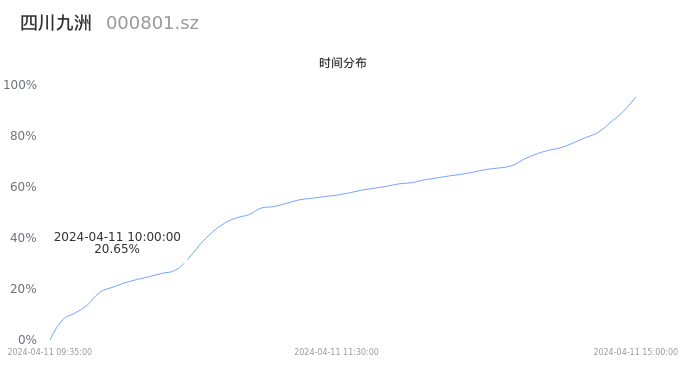 000801四川九洲2024年04月11日成交63.25万手,成交金额7.28亿元,相较昨日缩量374手,换手率6.18%,成交清淡。