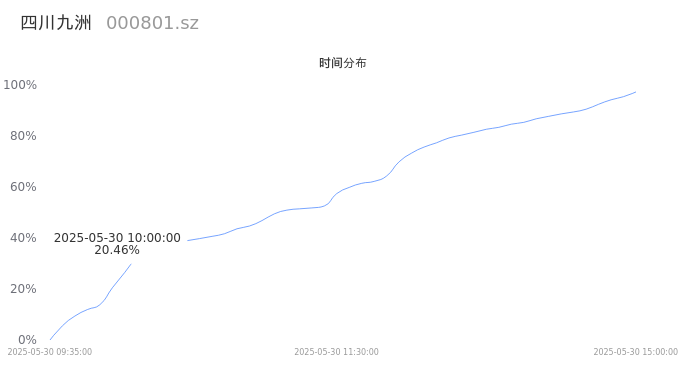 000801四川九洲2025年05月30日成交52.96万手,成交金额8.63亿,相较昨日放量19.32万手,换手率5.18%,成交清淡。